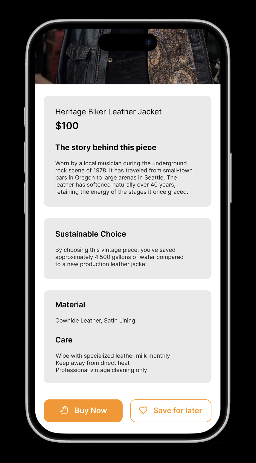 Design a post-scan product detail experience that reveals an item’s story and sustainability impact while maintaining low cognitive load during in-store browsing.