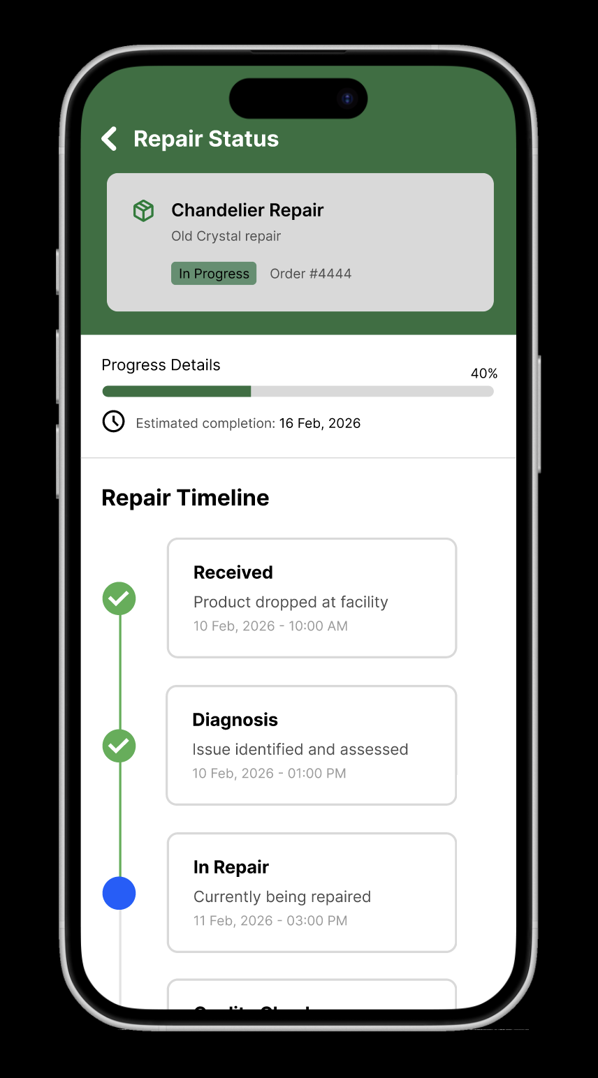 Design a mobile repair tracking interface that clearly communicates progress and reduces cognitive load.