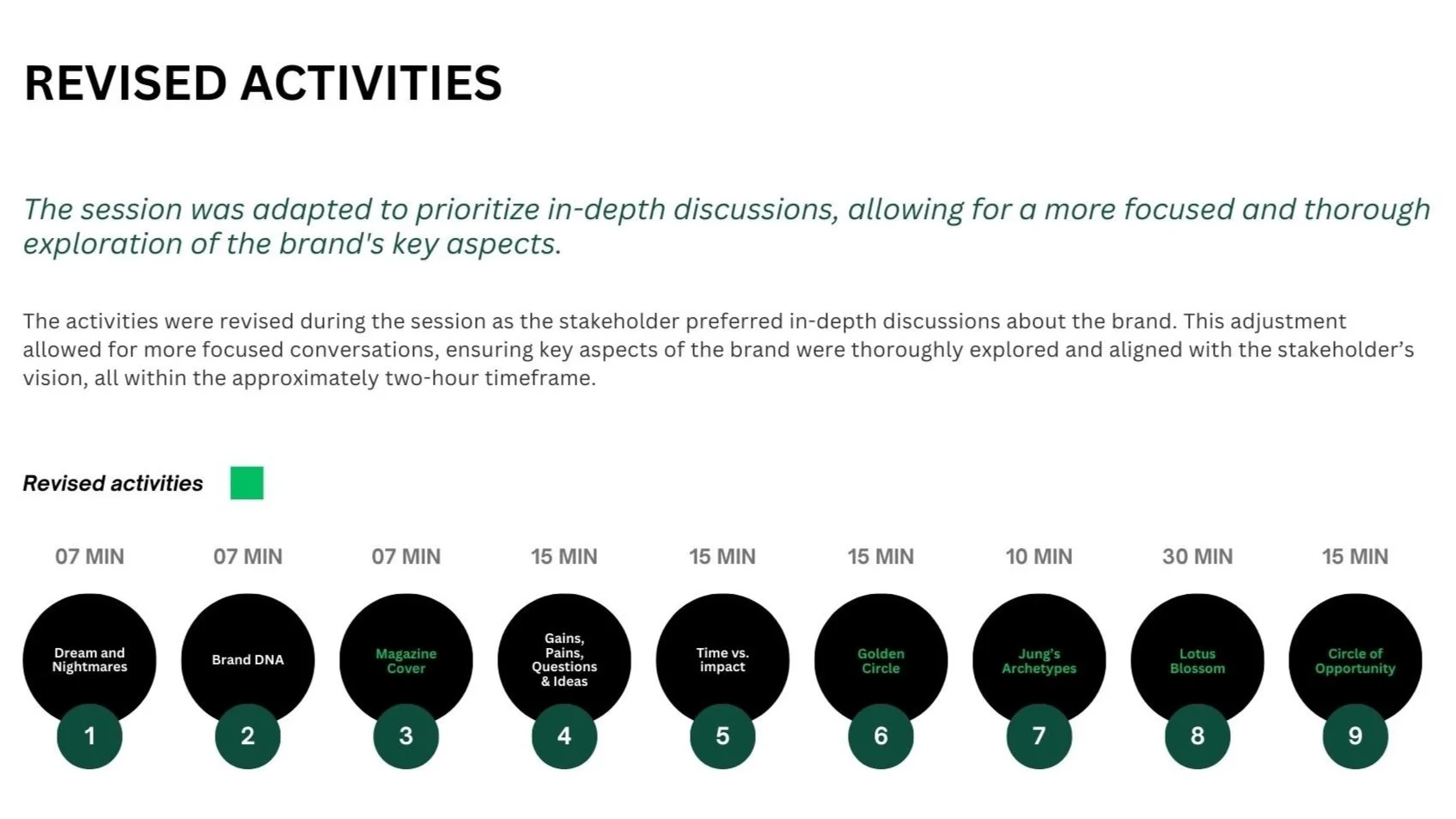 A structured session incorporating several exercises to analyze the brand’s core values, customer perceptions, and strategic positioning.
